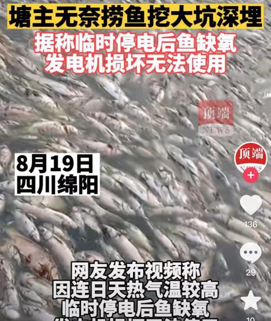 8 月 19 日,四川绵阳,网友发布视频,称因连日天热气温较高,临时停电后导致鱼缺氧,发电机损坏无法使用,大量鱼死飘满水面。