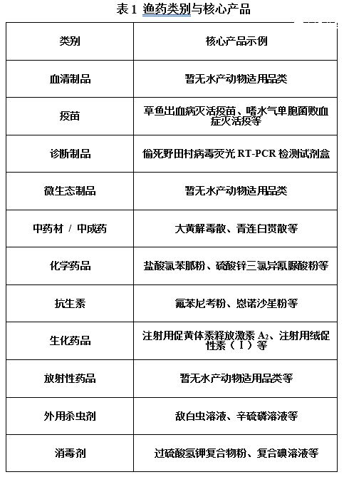 遵循《兽药管理条例》分类标准,与兽药类别保持一致,具体分为11大类(见表1)。目前经农业农村部批准使用的国标渔药有133个,其中化药(含抗生素、消毒剂、杀虫剂、激素等)68个,中药58个,生物制品(全部为疫苗)7个。见附件1。