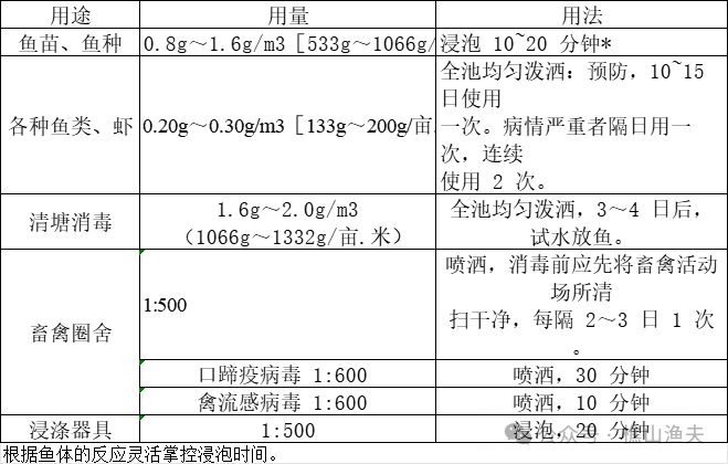 【用法与用量】以本品计。用水充分溶解后稀释 300 倍,全池遍洒:一次量,每 1m3 水体,0.5g。