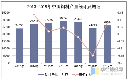 近年来,我国饲料产量保持平稳增长的态势。国家统计局数据显示,2019年全国饲料产量达26184万吨,同比增长8.14%,近6年全国饲料产量增速明显放缓。